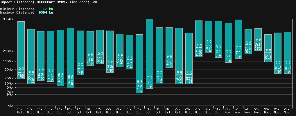 The graph that you see above is a screen shot from a real-time source that you can see here.  By clicking on that  link you see a real-time graph entitled “impact distances” for my station which is station number 3205.  It has 28 vertical bars, each reporting the impact distances for lightning strikes that my station detected on each of the 28 most recent days.  (The image at the top of the article is a screen shot from that real-time graph.)