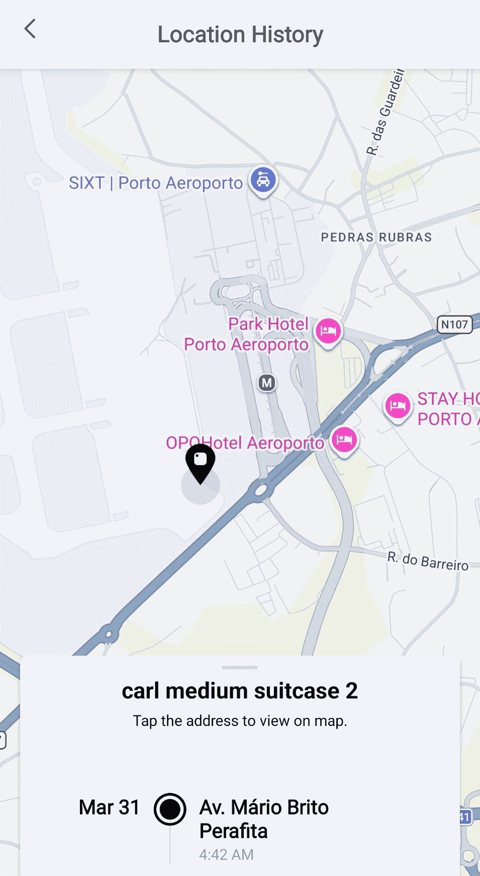 A week or so later, I clicked on my phone to see where my suitcase was, and I saw what you see above.  The suitcase had come to rest at Porto Airport in Portugal.