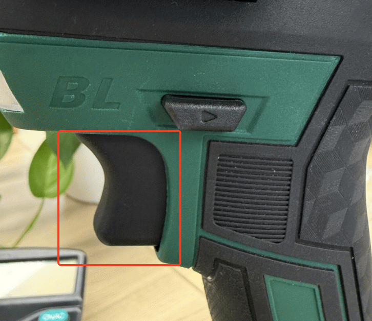 The trigger. The part of the wrench that the user will make use of more than any other part is the trigger, highlighted at right. I’d guess that most users are extremely familiar with the trigger, from previous experience with a cordless drill. With many cordless drills, the trigger is continuously variable across a continuous range of speeds. It is different with this wrench — the trigger can be pulled to any of three positions, yielding any of three amounts of speed and torque.