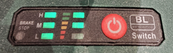 Second learning opportunity. Push the direction button to the left (which selects clockwise rotation of the socket). Tap the trigger briefly and lightly. Take a quick look at the indicator panel. If you look quickly enough, you can see the status of the “power level” LEDs, just as in the previous learning opportunity just discussed. They tell you the state of charge of the battery. You can also see the status of the “speed” LEDs (H, M, and L). The “speed” LEDs are discussed below. But next we will talk about “brake stop”.