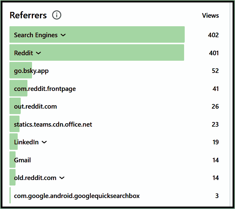 As you can see, there is also some traffic from BlueSky (“bsky” in the bar graph) and from LinkedIn.